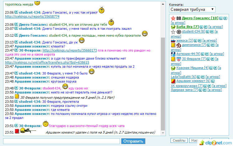 Обратил я как то внимание в чате на действия консультанта http://icekings.ru/users/638615 , да что там консультанта, целого главы консультантов на 11х11, точнее на его трансферы, которые немного подозрительны своей схемой, покупаем игрока за половину номинала, продаем спустя неделю того же игрока за 2 номинала ( по такой схеме продано 6 игроков, может быть товарищ консультант объяснит чем он руководствовался совершая данные сделки?) http://icekings.ru/xml/office/transfers.php?&id=638615