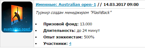 И так, представляю Вам свой именной турнир из серии большого шлема - Australian open. Время турнира в 09-00 Буду очень рад и признателен, если Вы поддержите мою инициативу Эскизы прикрепленных изображений -------------------- |