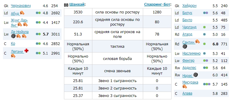 А вы уверены, что у вас 3-ее звано вообще выходило на лёд? Смотрите полный лог, там расписаны все замены. И как я предполагаю, в звеньях ">" и "<" у вас тоже выставлены игроки 1-2 звеньев. Окей, а где третье звено потерялось? Насколько я знаю двумя звеньями выйти на матч нереально. |